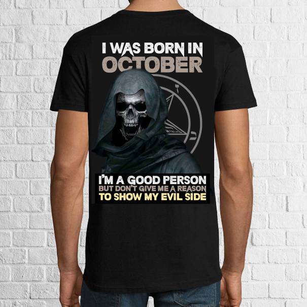 Tricou de bărbat imprimat pe spate cu grafică de mari dimensiuni și mesajul: I was born in October, I’m a good person, but don’t give me a reason to show my evil side”. Un mesaj care îi atenționează pe impertinenți despre caracterul aparent bun, dar care merge până la o limită, al celor născuți în octombrie.