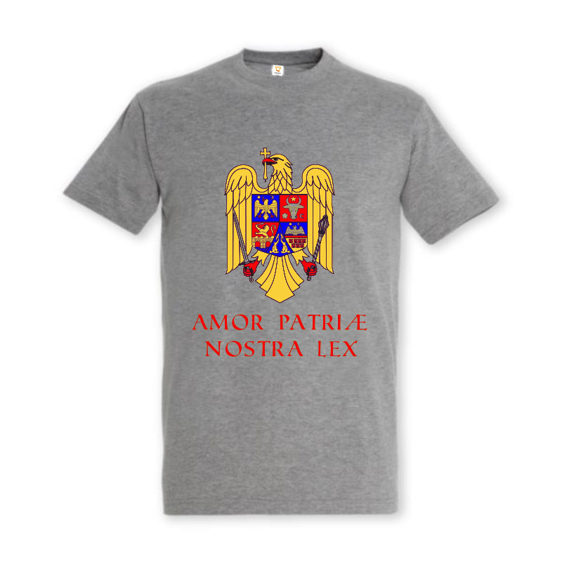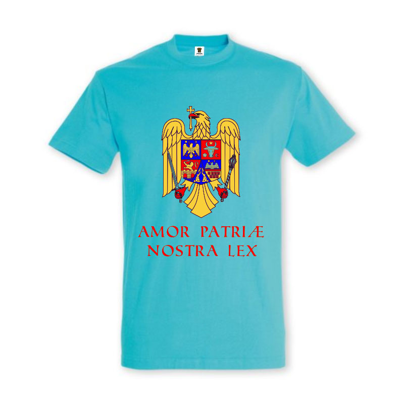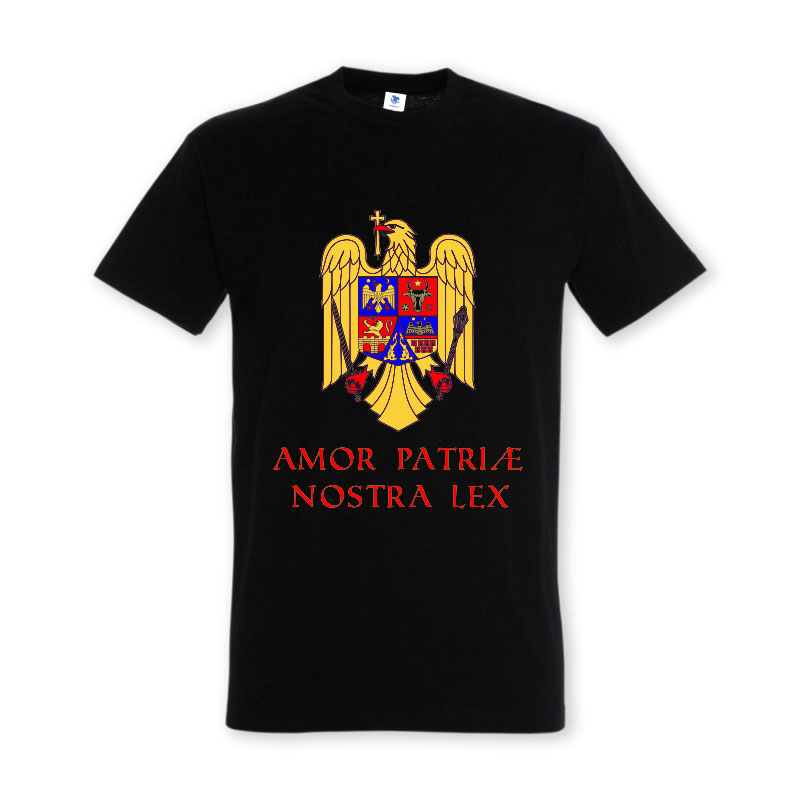 Pentru românii patrioți propunem un tricou imprimat cu maxima latina „Amor patriae nostra lex” (Iubirea patriei este legea noastră) alături de stema României.