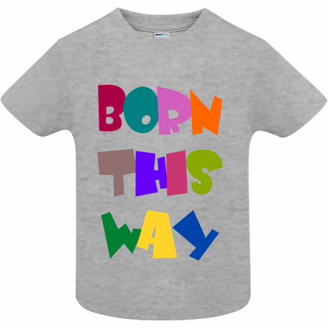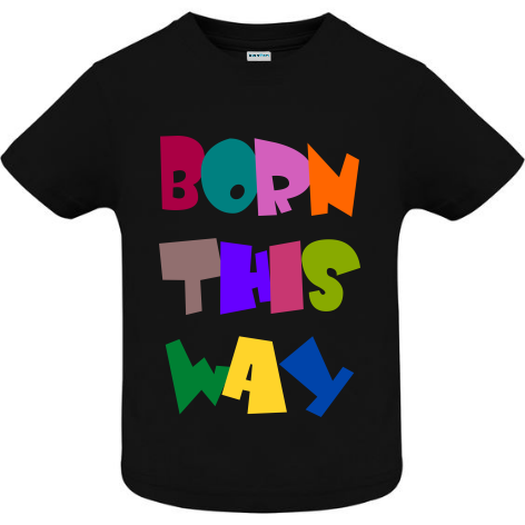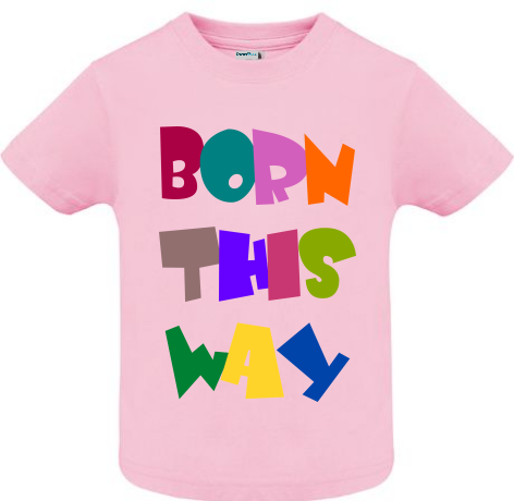 Tricou 100% bumbac pentru copii imprimate digital cu vopsea ecologică pe bază de apă cu mesajul: Born this way scris cu caractere multicolore.