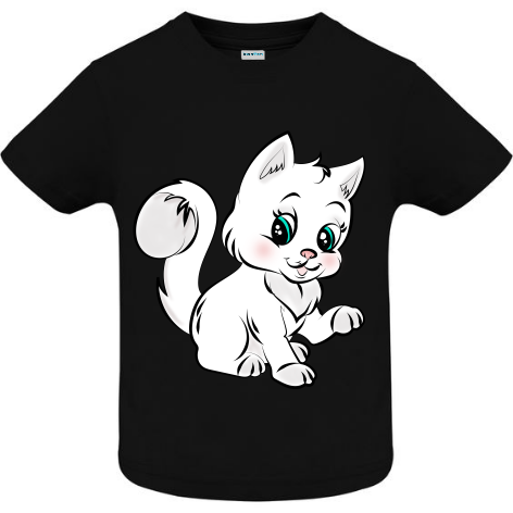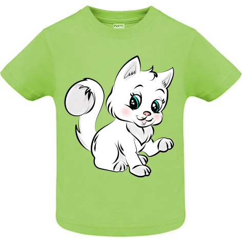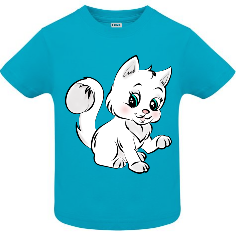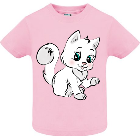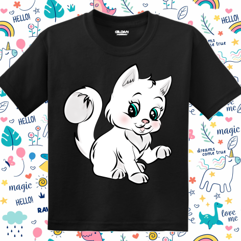 Tricou 100% bumbac pentru copii imprimate digital cu vopsea ecologică pe bază de apă cu un desen cu o pisica alba.