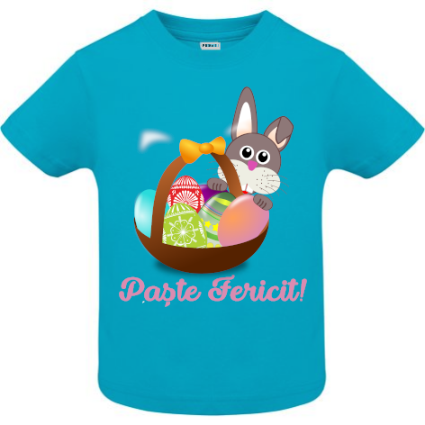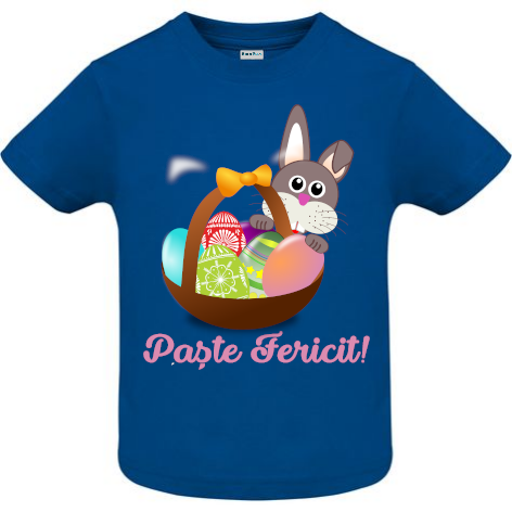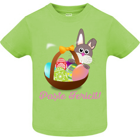 Tricou copii – Iepuraș de Paște cu coș – este un tricou din bumbac imprimat digital cu vopsele pe bază de apă sigure pentru orice vârstă