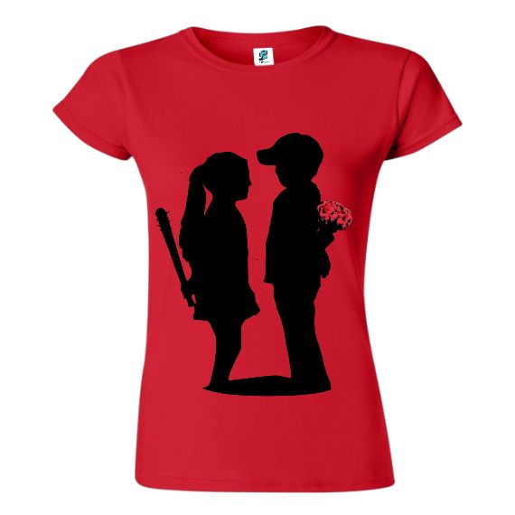 Imaginea imprimată pe un tricou de damă denumit Boy Meets Girl spune o poveste despre deziluzia iubirii. Dacă ți s-a întâmplat asta și vrei să le atragi și altora atenția sau doar să spui povestea ta acest obiect vestimentar te poate ajuta. Imaginea este o reproducere după o lucrare stradală londoneză atribuită artistului rămas anonim care se semnează Banksy.