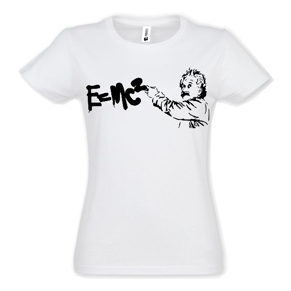 Tricou regular din bumbac de damă reprezentându-l pe Einstein Vandal in stilul lucrărilor stradale, diverse culori și mărimi.
