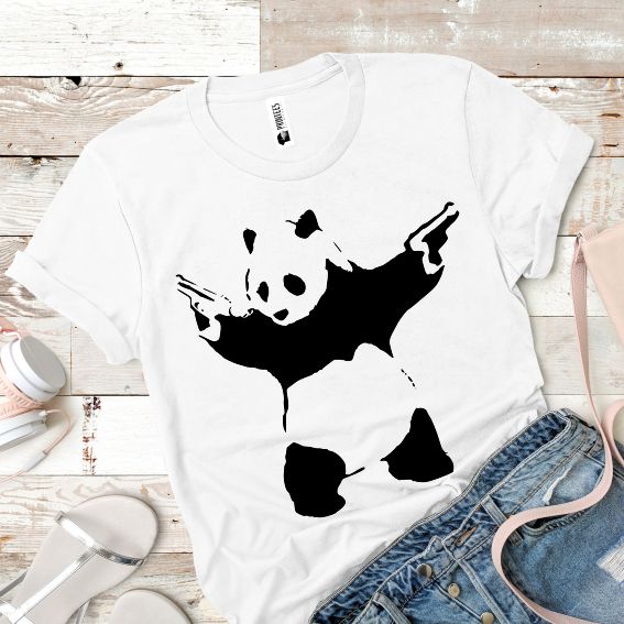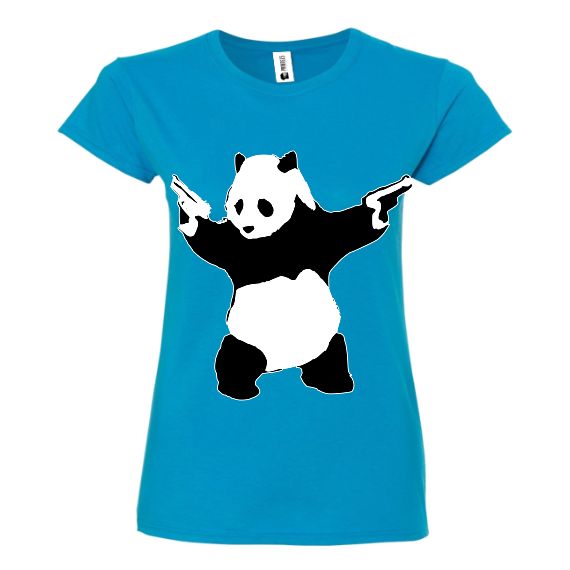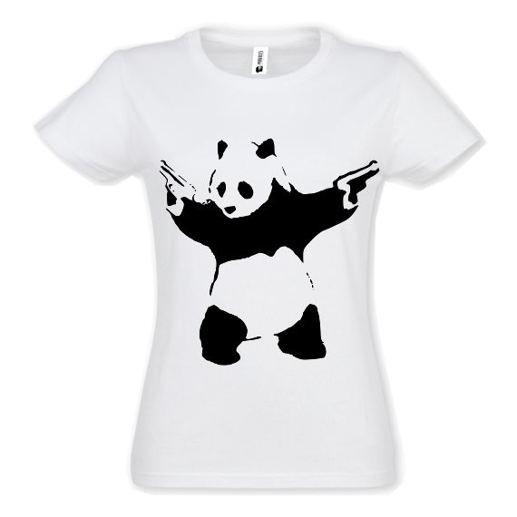 Tricou regular din bumbac pentru damă Gangsta Panda, cu un panda in stilul lucrărilor stradale, diverse culori și mărimi.