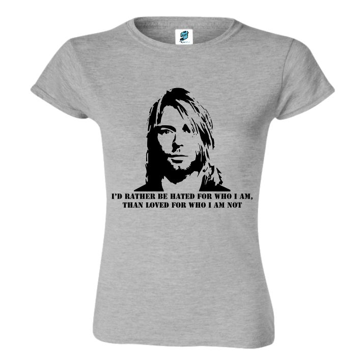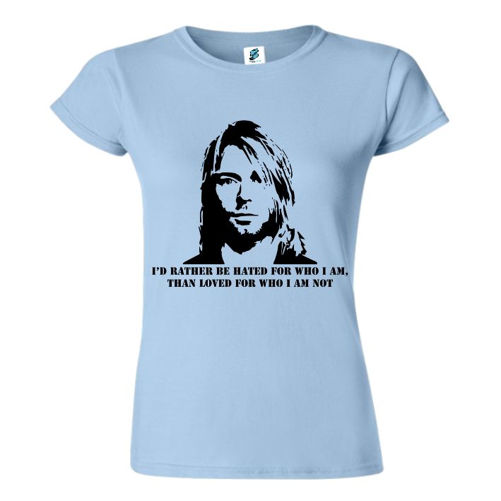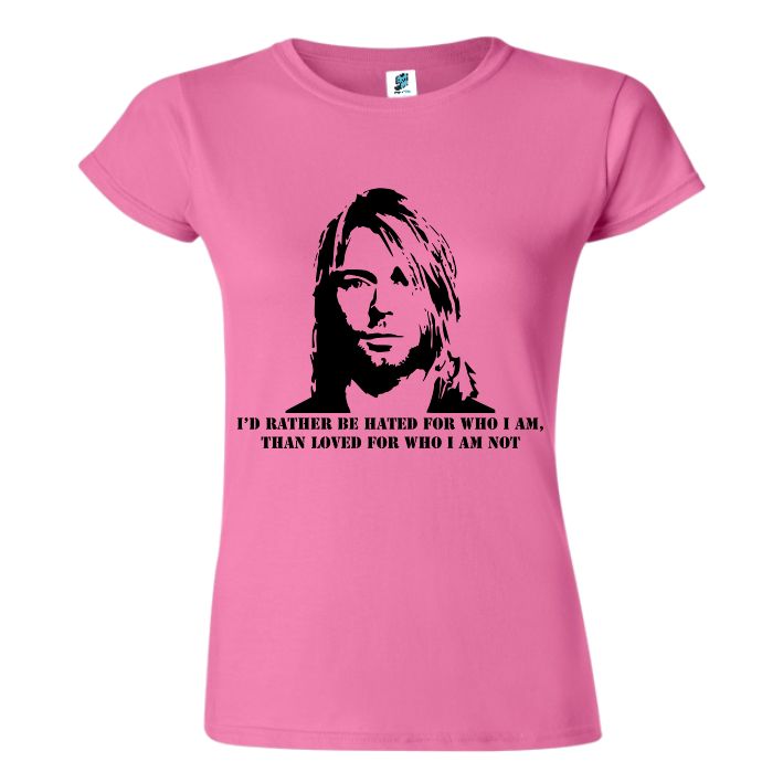 Tricou regular din bumbac pentru damă imprimat cu un citat celebru al lui Kurt Cobain: I’d rather be hated for who I am, than loved for who I am not.
