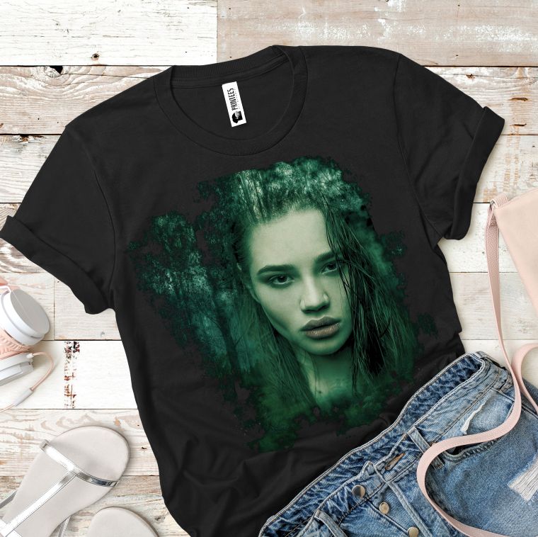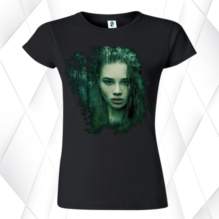Tricou negru slim fit din bumbac pentru damă imprimat digital cu un portret fantezist cu o femeie cu o pădure întunecată în fundal.