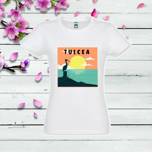 Tricou dama Tulcea este un tricou pe care îl poți purta când vizitezi Delta Dunării și vrei să fii asortată. Alege acest model de tricou cu pelican și un apus de soare ce inspiră la visare.